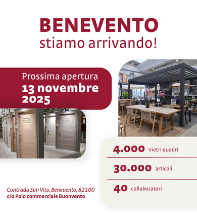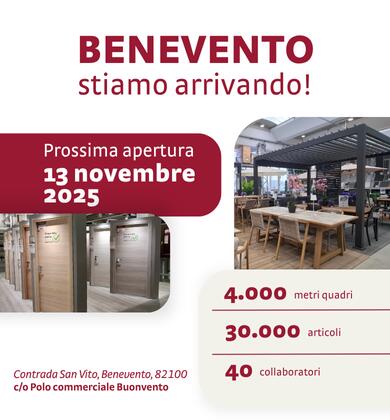 In vista dell'apertura del nuovo negozio Bricocenter a Benevento, ti aspettiamo nel nostro pop-up al Parco Commerciale Buonvento S.S.7, Contrada San Vito (Benevento). Siamo aperti tutti i giorni dalle 10 alle 13,30 e dalle 16 alle 20. Scopri il mondo Bricocenter: ricevi informazioni, candidati per lavorare con noi o proponi la tua attività artigianale.