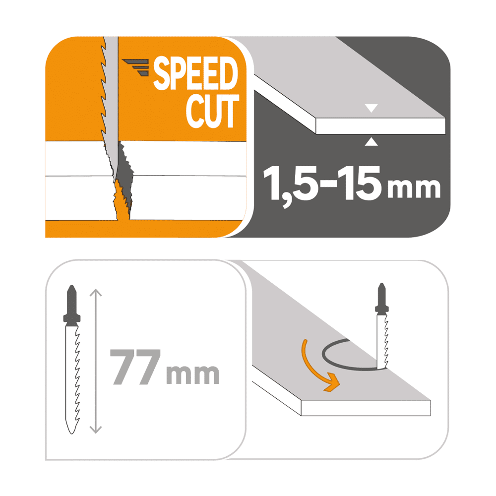 Adatta per tagli curvi, precisi, netti da 15 mm su legno tenero. Attacco a T, lunghezza 80 mm