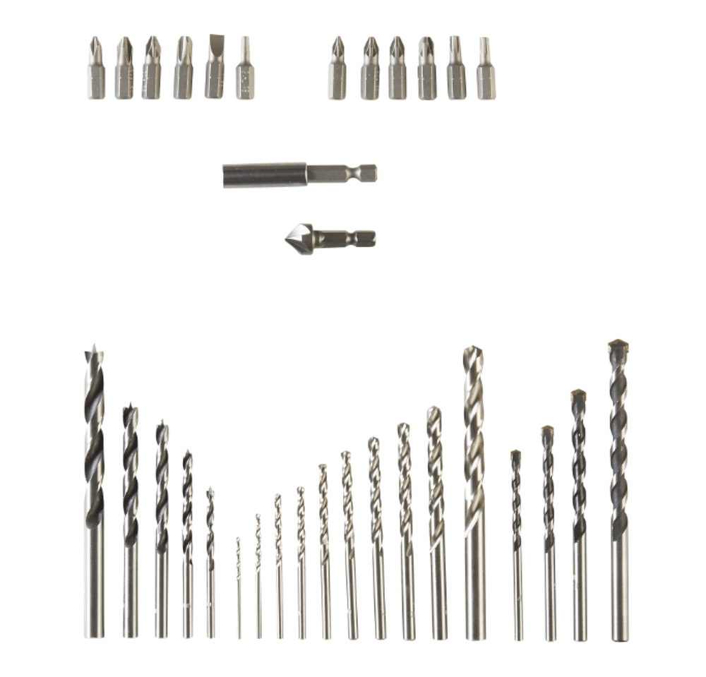 - Include: punte per forare metalli medio-duri, come acciaio dolce, alluminio, materiali da costruzione (mattoni, blocchi di calcestruzzo, calcestruzzo), tutti i tipi di legno tenero