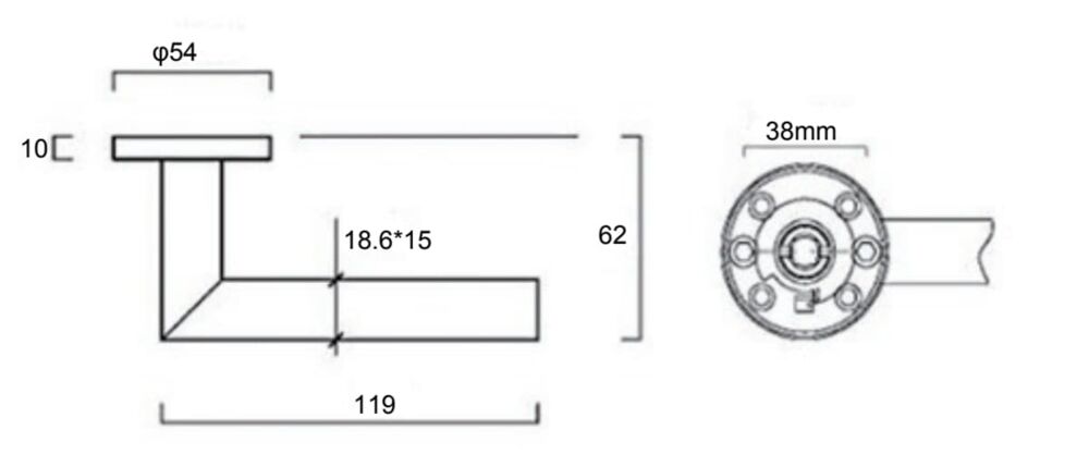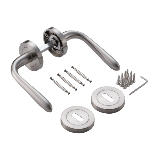 Coppia di maniglie, due grani di fissaggio, chiave esagonale per grani, due bocchette, viti da legno, quadro Q8.
