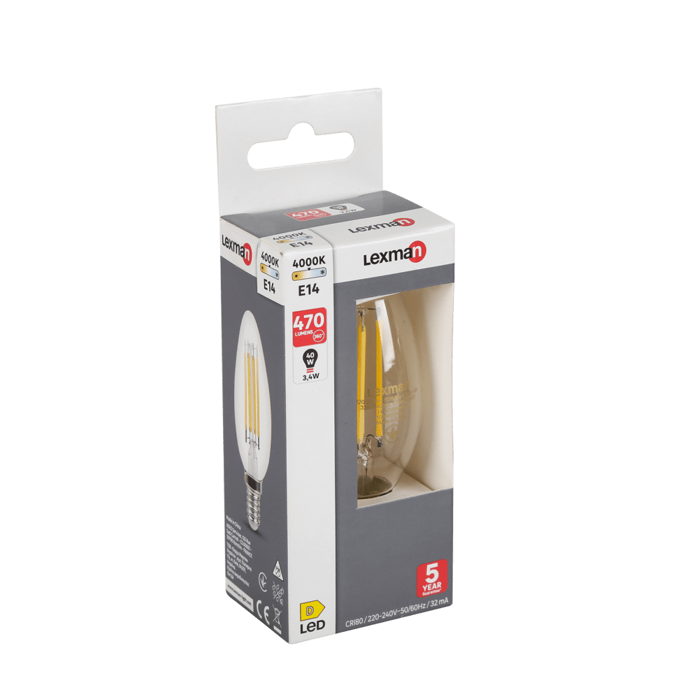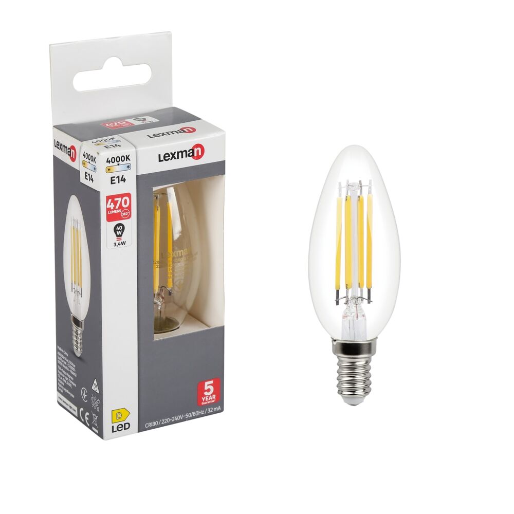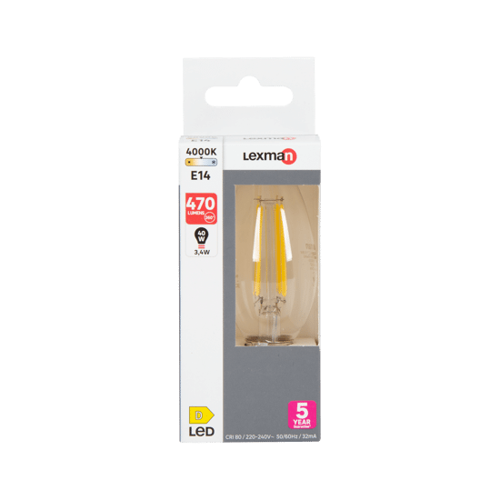 Lampadina LED, E14 oliva, trasparente, luce naturale, 4.5W= 470LM (equiv 40 W), 330°, LEXMAN