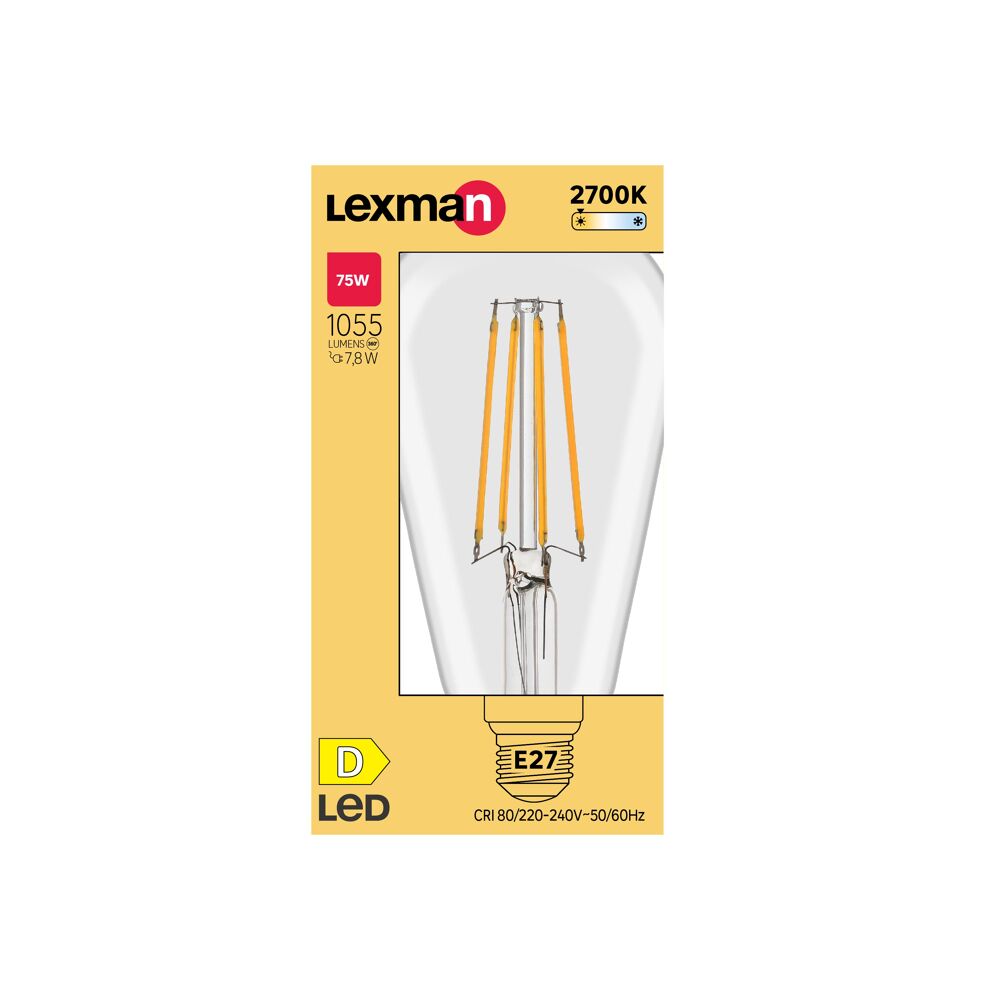 Lampadina LED filamento, E27, goccia, trasparente, 7.8W=1055LM (equiv 75 W), 360° , LEXMAN