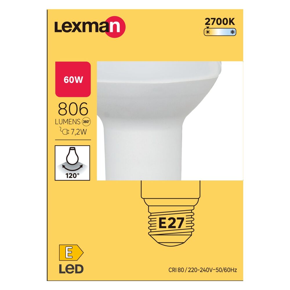 Lampadina LED, E27, faretto, senza, luce calda, 7.2W=806LM (equiv 60 W), 120° , LEXMAN