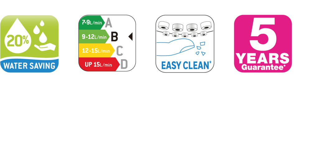 - Variatore di portata integrato nella doccetta per un risparmio acqua senza compromettere il getto