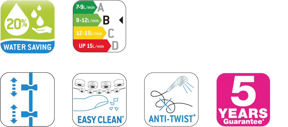 - Il limitatore di portata della doccetta garantisce un risparmio idrico senza compromettere il getto