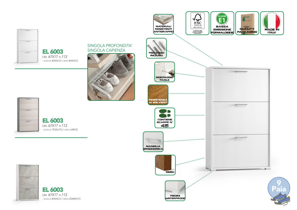 - salvaspazio, ideale per spazi stretti (dietro una porta, in corridoio) con piedini, per una pulizia più facile del pavimento con anta più alta, per scarpe da uomo o con tacchi