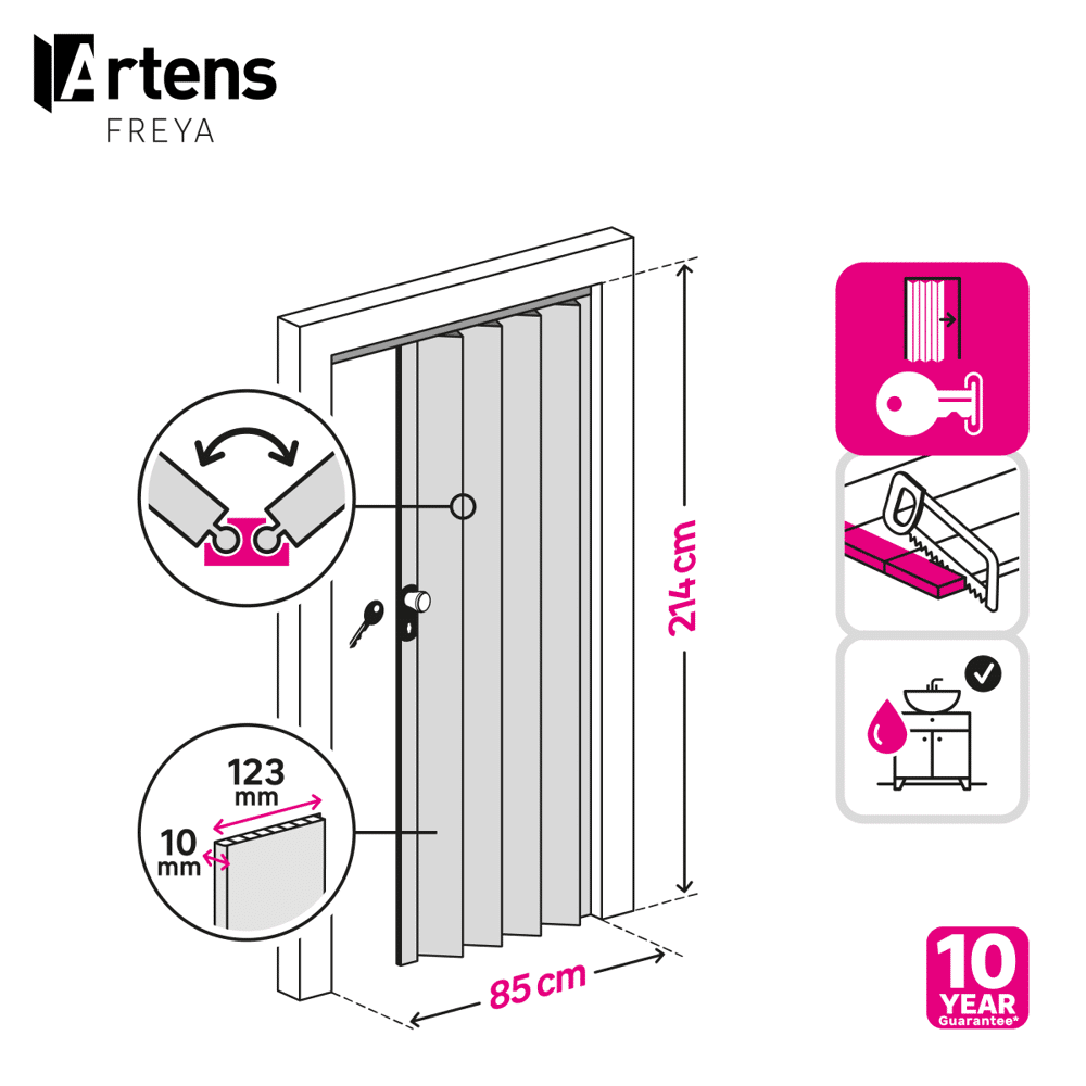 - Reversibile, le doghe possono essere tagliate dal basso per adattarsi all'altezza e possono essere rimosse per ridurre la larghezza della porta. Maniglia e serratura in plastica con chiavi incluse