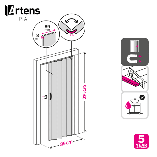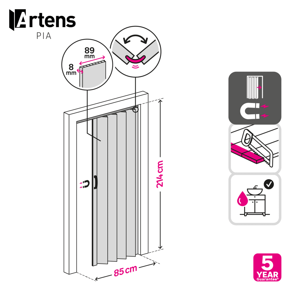 - Reversibile, le doghe possono essere tagliate dal basso per adattarsi all'altezza e possono essere rimosse per ridurre la larghezza della porta. Maniglia e serratura in plastica con chiavi incluse