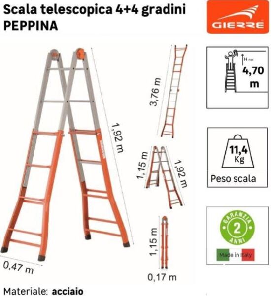- La scala telescopica GIERRE è prodotta in acciaio e ha una portata massima di 125 kg. La sua struttura in acciaio è particolarmente resistente agli urti.