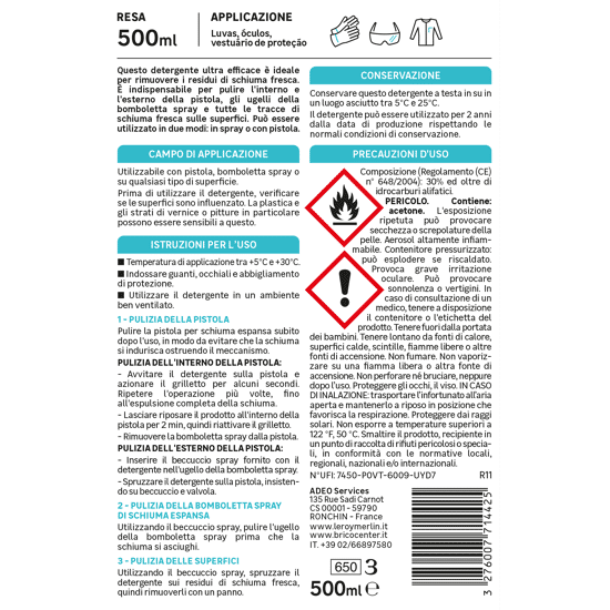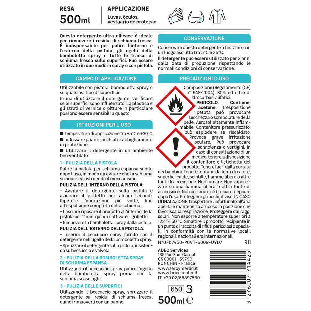 DETERGENTE PER SCHIUMA POLIURETANICA FRESCA DA USARE PER PISTOLE O COME SPRAY AXTON 500ML