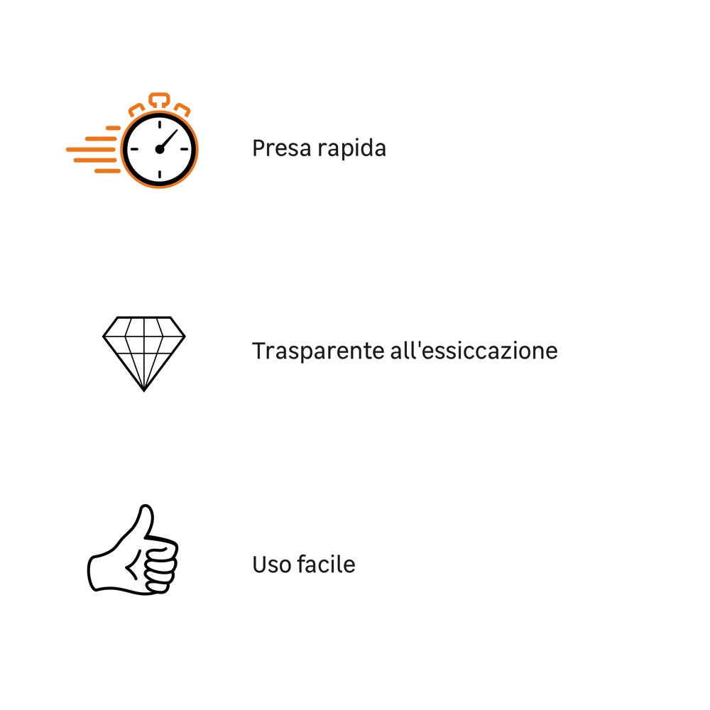 - La sua essiccazione trasparente consente l'applicazione su tutti i tipi di supporto senza lasciare traccia.