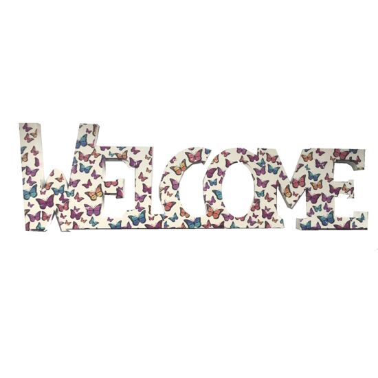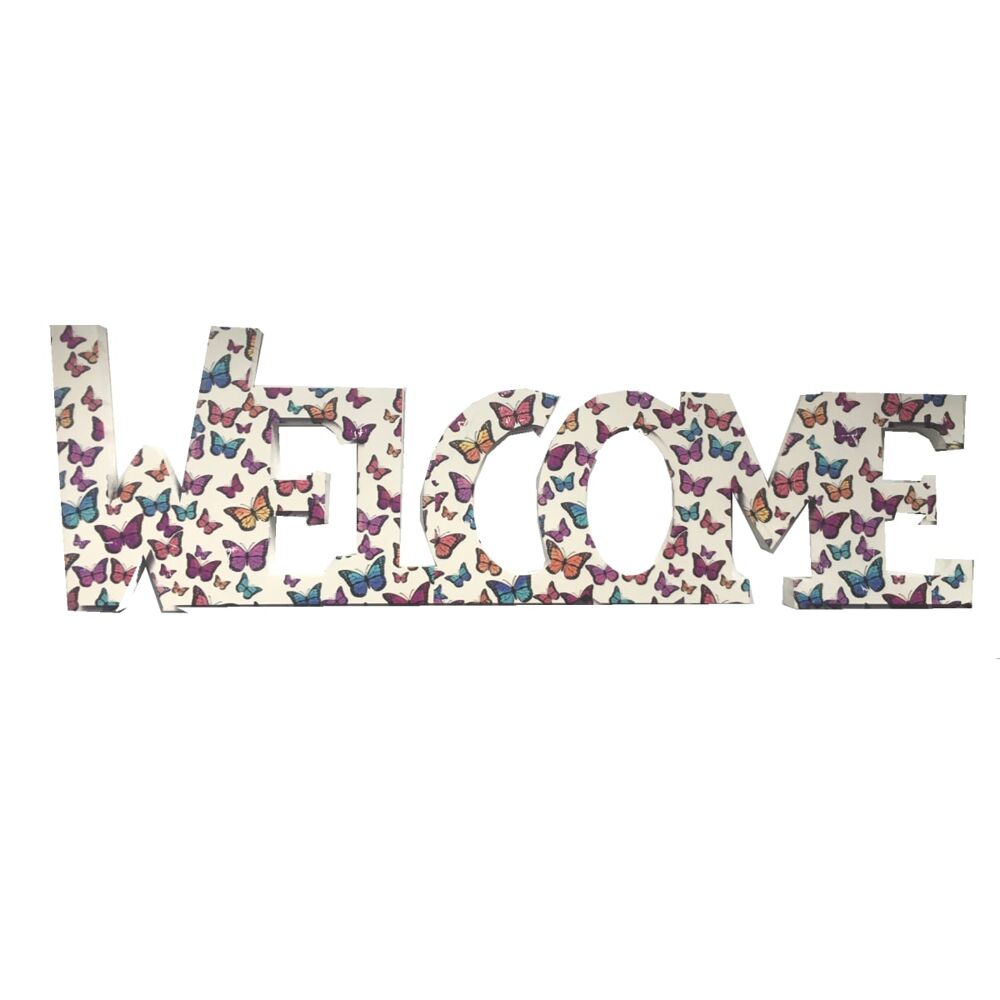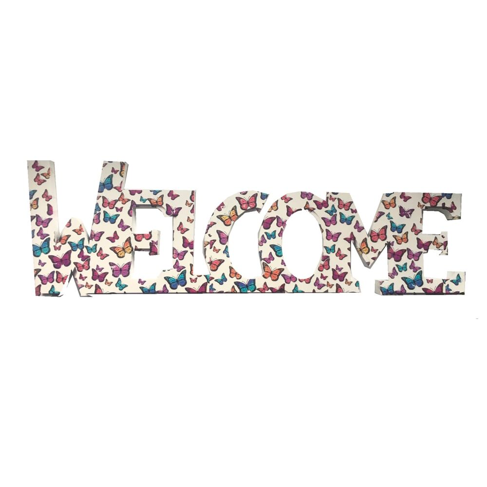 Decorazione da parete su legno welcome farfalla 40x13.5 cm
