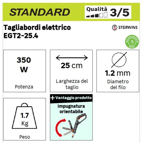- Leggero e pratico, ha una maniglia rotante per un taglio preciso e senza sforzo. L'impugnatura integrata e lo slot per il collegamento della linea all'impugnatura rendono il lavoro più confortevole. Sterwins prodotti di qualità: 5 anni di garanzia, comprovata durata e molti pezzi di ricambio disponibili