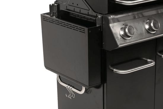 - Coperchio in acciaio smaltato con termomentro integrato, portaposate laterale, due ante a mobiletto inferiori per riporre supporti di cottura