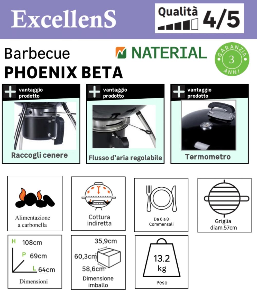 Titolo: Barbecue a Carbonella Phoenix Beta di Naterial - Griglia Elegante e Funzionale per Grigliate all'Aperto Punti Chiave: - Design Elegante: Il Barbecue Phoenix Beta combina stile e funzionalità , rendendo ogni grigliata un’esperienza unica. - Cottura Autentica: Grazie alla sua costruzione di alta qualità , offre risultati eccellenti per ogni tipo di cottura. - Versatilità : Ideale per ogni occasione, dalle feste in giardino alle cene intime, per rendere ogni pasto speciale. - Facile da Usare: Semplice da montare e utilizzare, perfetto per grigliatori principianti e esperti. - Materiali Resistenti: Realizzato con materiali durevoli che garantiscono una lunga vita al prodotto. Descrizione: Scopri il Barbecue a Carbonella Phoenix Beta di Naterial, progettato per coloro che amano le grigliate all'aperto. Con il suo design elegante e funzionale, questo barbecue non solo arricchisce il tuo spazio esterno, ma offre anche un'autentica esperienza di cottura. Perfetto per ogni occasione, il Phoenix Beta ti permette di preparare deliziosi pasti con facilità e stile. Grazie alla sua costruzione robusta e ai materiali di alta qualità , puoi contare su risultati di cottura eccellenti, che faranno felici i tuoi ospiti. Che si tratti di un barbecue estivo o di una cena invernale, questo modello è versatile e adatto a ogni esigenza. Inoltre, il barbecue è progettato per essere facile da montare e utilizzare, rendendolo una scelta ideale sia per i principianti che per i grigliatori esperti. Non perdere l'opportunità di rendere ogni pasto un momento speciale con il Barbecue a Carbonella Phoenix Beta di Naterial.