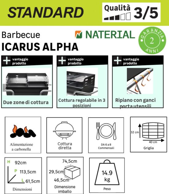Titolo: Barbecue a Carbonella Icarus Alpha di Naterial - Griglia Elegante e Funzionale per Grigliate all'Aperto Design Elegante: Il Barbecue Icarus Alpha si distingue per il suo aspetto raffinato, perfetto per ogni giardino o terrazzo. - Facilità d'Uso: Grigliare diventa un gioco da ragazzi grazie alla sua intuitiva funzionalità , ideale per principianti e esperti. - Materiali di Alta Qualità : Costruito con materiali resistenti e durevoli, garantisce prestazioni eccellenti. - Momenti Indimenticabili: Perfetto per riunioni con amici e familiari, crea occasioni di convivialità e divertimento. - Facile da Pulire: Design pensato per una manutenzione semplice, così puoi goderti le grigliate senza preoccupazioni. Descrizione: Scopri il Barbecue a Carbonella Icarus Alpha di Naterial, la scelta ideale per le tue grigliate all'aperto. Con un design elegante e funzionalità ottimali, questo barbecue è realizzato in materiali di alta qualità , assicurando che ogni grigliata sia un successo. È perfetto per condividere momenti indimenticabili con amici e famiglia, rendendo ogni incontro speciale. La facilità d'uso del Icarus Alpha lo rende adatto sia per chi è alle prime armi sia per i grigliatori esperti. Grazie alla sua costruzione robusta, potrai godere di prestazioni eccellenti nel tempo. Inoltre, la pulizia è semplice e veloce, permettendoti di trascorrere più tempo a divertirti e meno a preoccuparti della manutenzione. Scegli il Barbecue a Carbonella Icarus Alpha di Naterial e trasforma ogni pasto in un evento memorabile.