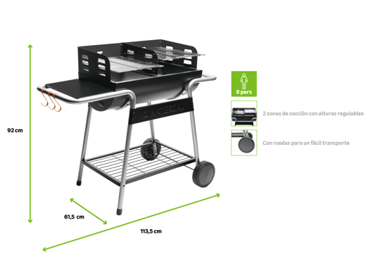 - Ideale per 6 persone Doppia griglia: 2 zone di cottura differenti ad altezza regolabile