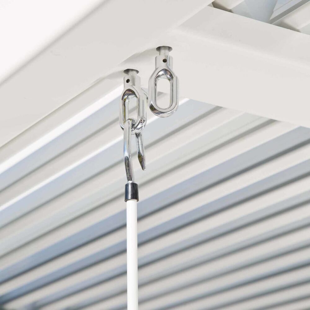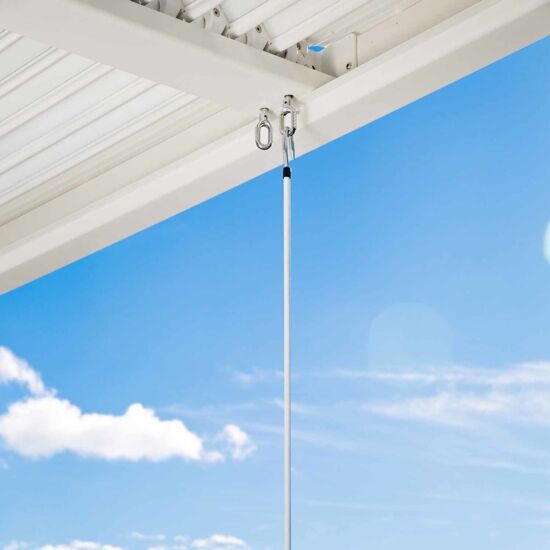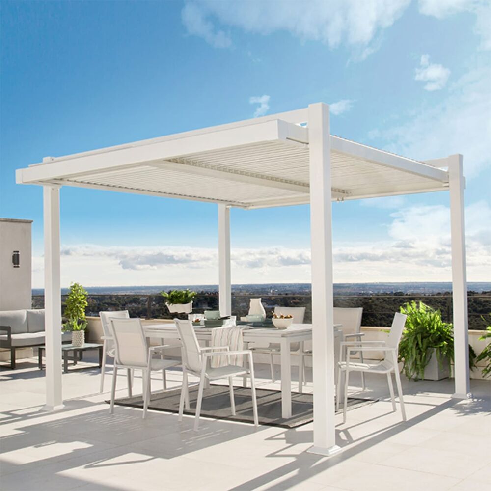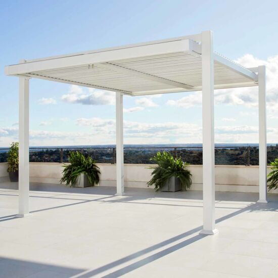 La pergola bioclimatica da giardino Persea può essere fissata a terra tramite le apposite viti incluse in dotazione, offrendo stabilità e sicurezza nel tempo. La finitura bianco valorizza la luminosità degli spazi esterni e crea un ambiente armonioso, ideale per vivere l’outdoor con stile e funzionalità.