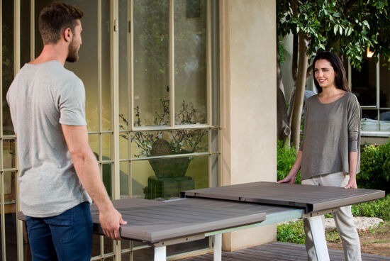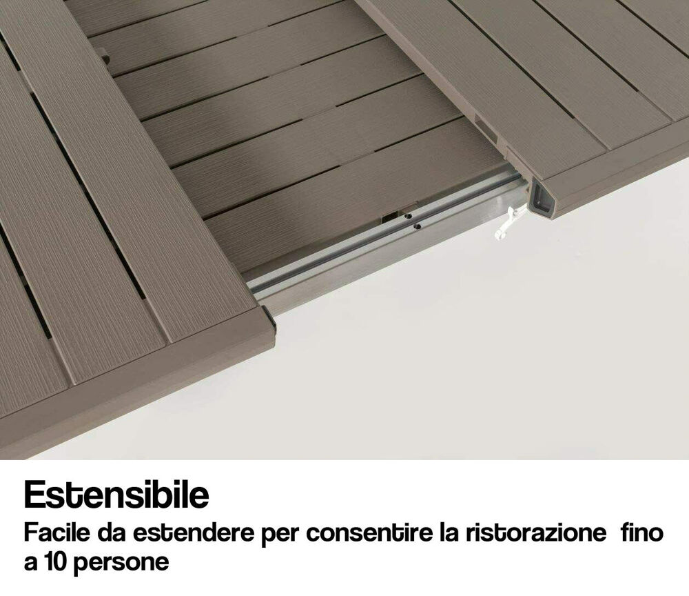 - Facile da assemblare. Ha una struttura resistente che non arrugginisce ed è facile da pulire (con acqua e sapone). Il suo sistema allungabile viene effettuato manualmente dalla parte centrale, ampliandone la capienza in modo semplice. Per la sua manutenzione si consiglia di riporlo al coperto, al riparo dal sole diretto, e di riporlo in luogo asciutto e ventilato quando non utilizzato (oppure coprirlo con un telo per mobili). Si combina con il resto degli elementi della serie Harmony.