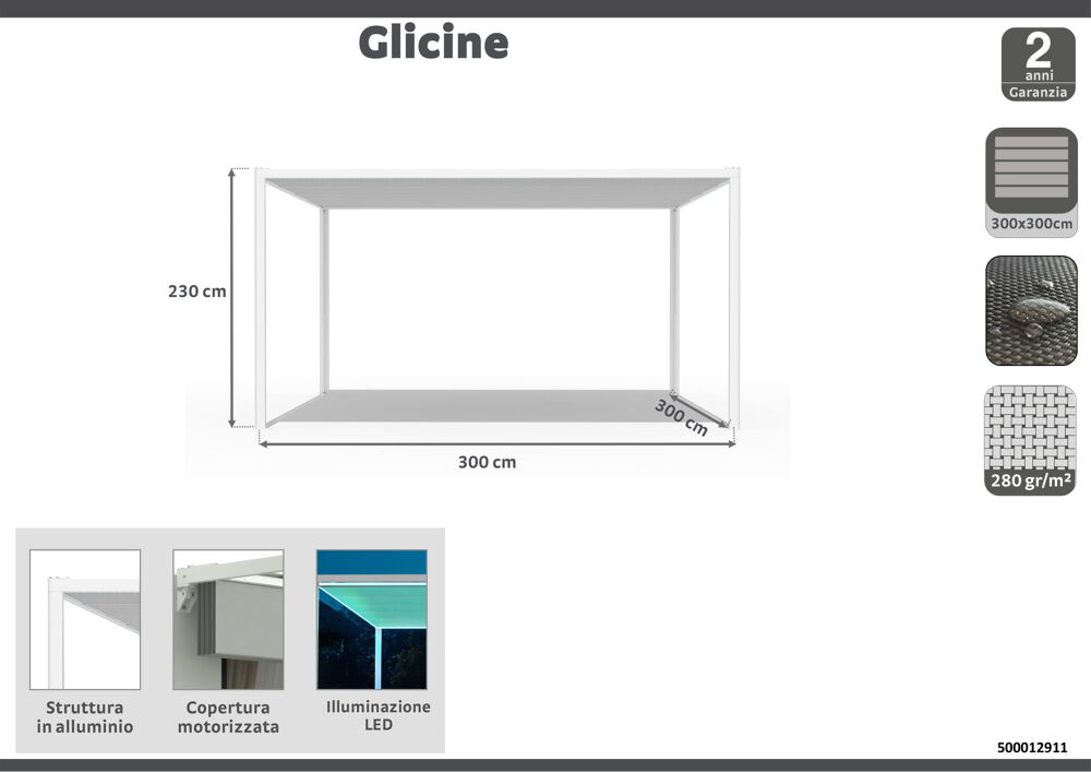 PERGOLA IN ALLUMINIO GLICINE L294xP294xH235 BIANCA COPERTURA MOTORIZZATA ILLUMINAZ. LED