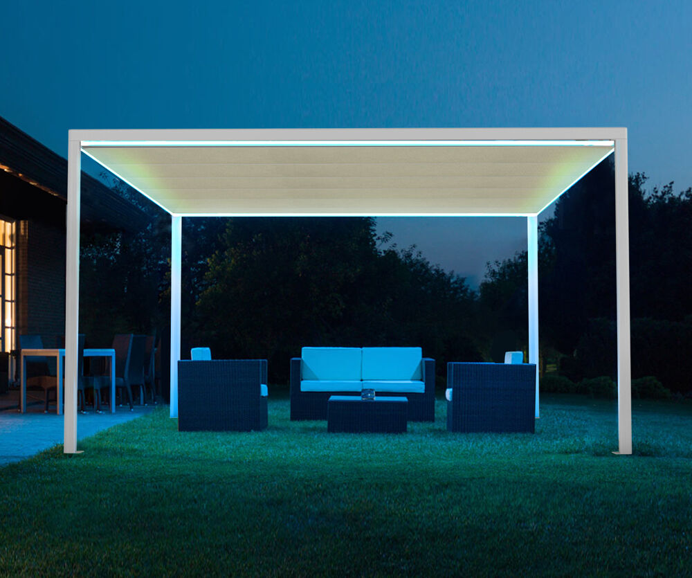 L’illuminazione LED integrata permette di vivere la pergola da giardino Glicine anche nelle ore serali, creando un’atmosfera accogliente. L’installazione è semplice e rapida: non sono necessari cablaggi complessi, è sufficiente collegare la struttura a una presa elettrica per attivare sia la motorizzazione sia l’illuminazione.