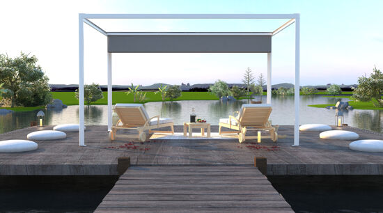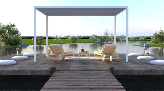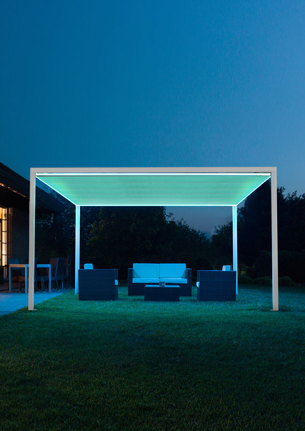 La finitura bianca dona alla pergola Glicine un’estetica pulita e raffinata, ideale sia per contesti classici sia per ambienti moderni. Un complemento d’arredo outdoor versatile, progettato per unire tecnologia, design e comfort in un’unica soluzione.
