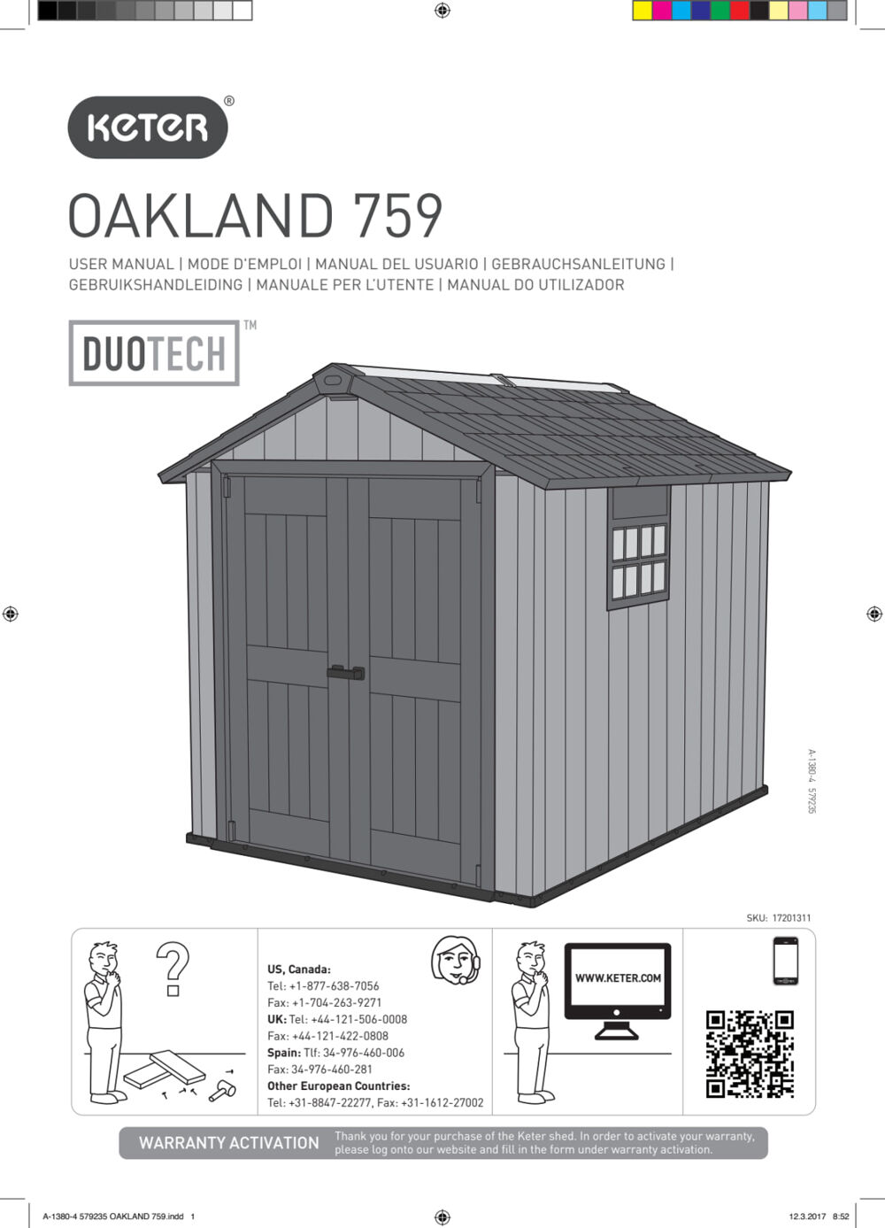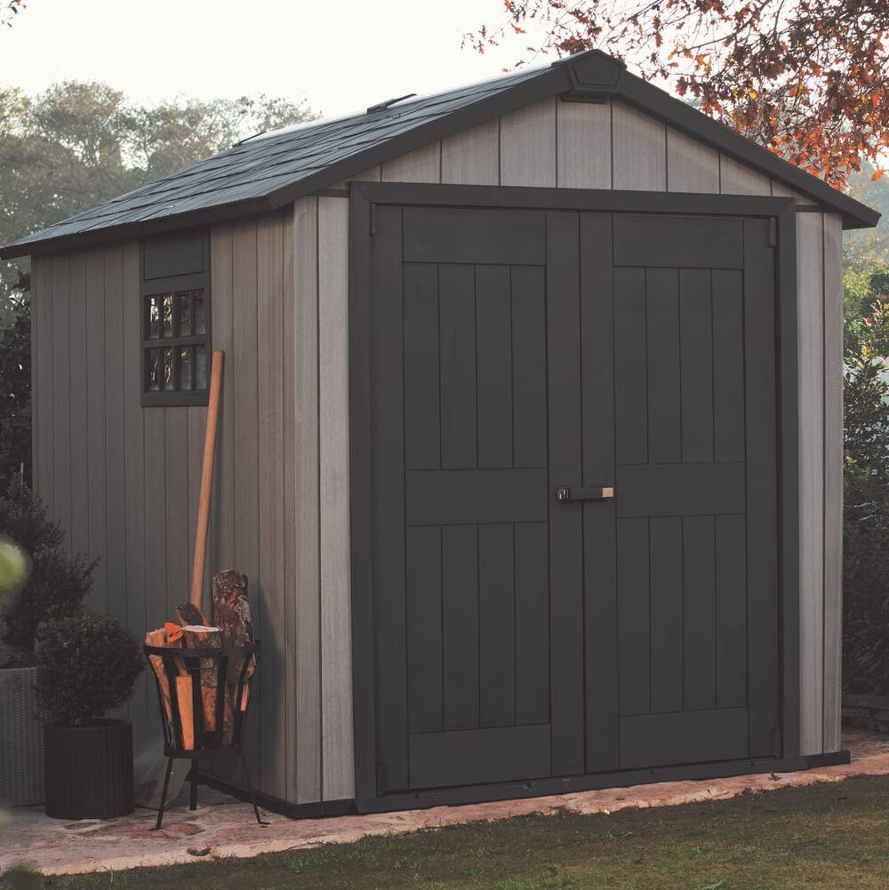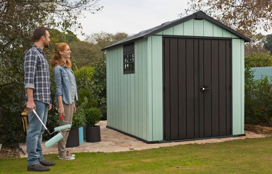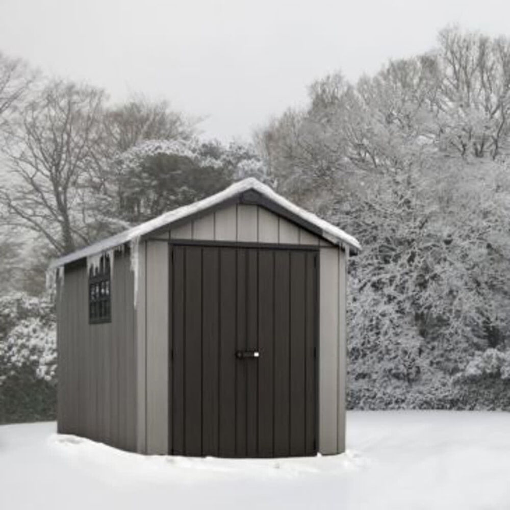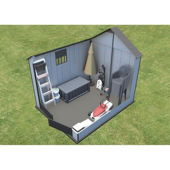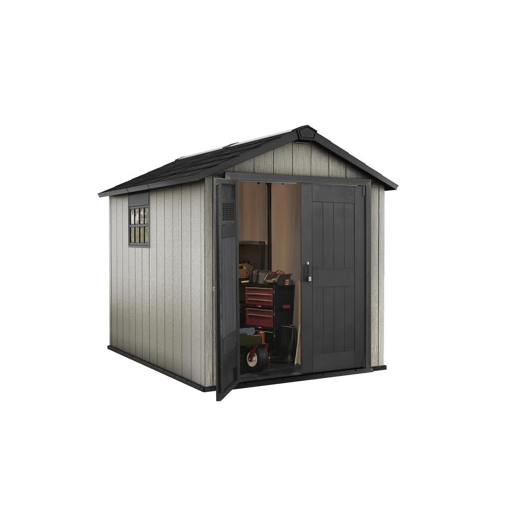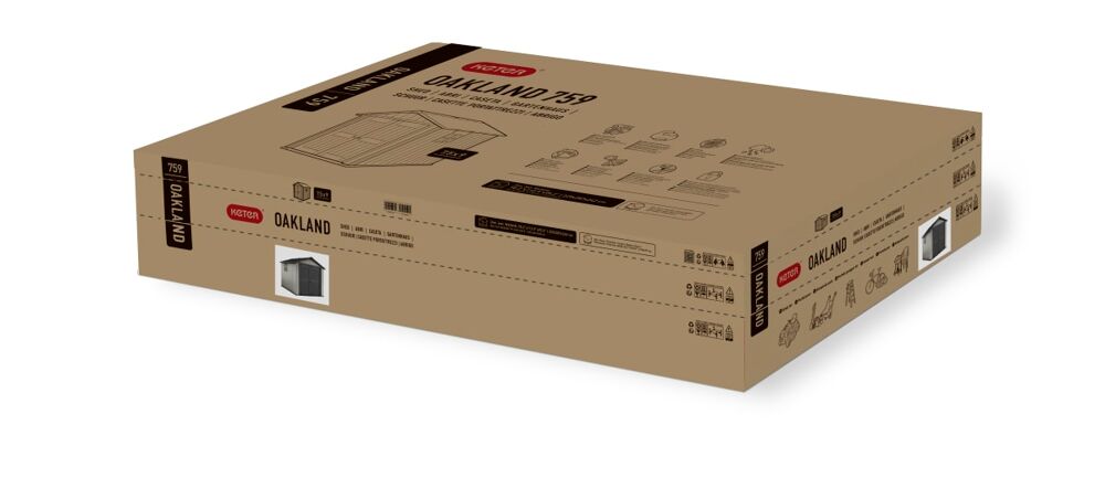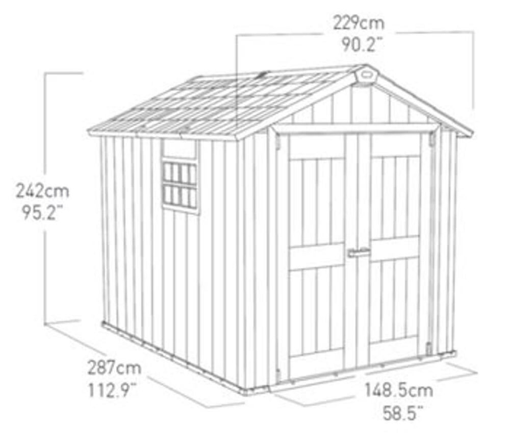 Casetta da giardino in polipropilene Oakland 759 KETER, Dimensioni interne: 264x201cm, superficie interna 5,31mq , dimensioni esterne: 279x210cm, altezza massima: 242 cm.