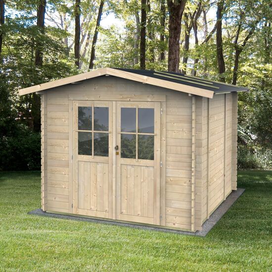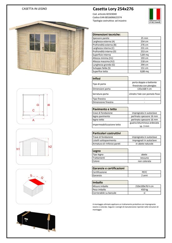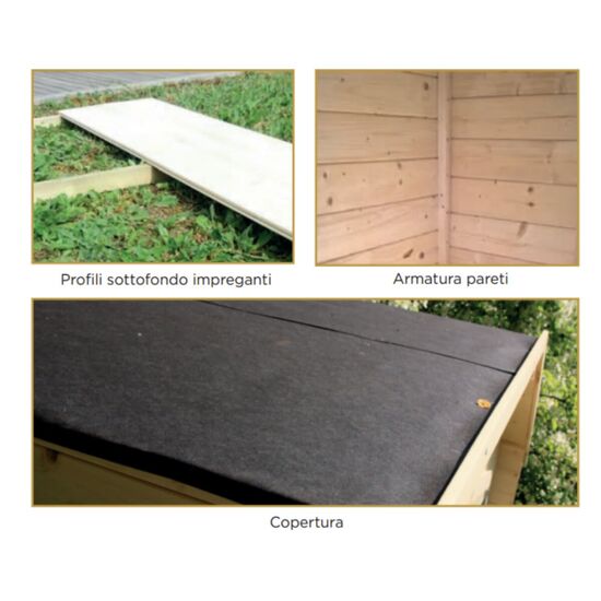 Casetta da giardino in legno Lory, dimensioni interne: 253x231cm, superficie interna 5,84mq, dimensioni esterne: 276x254cm, altezza massima 218cm