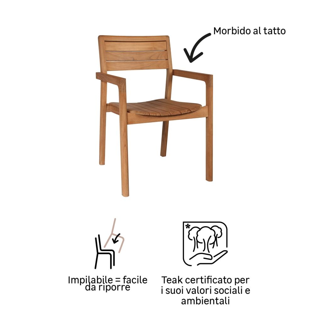 Sedia da giardino senza cuscino Aurora NATERIAL con braccioli in teak con seduta in teak marrone