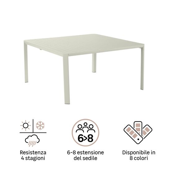 Perfetto come tavolo da pranzo per patio e terrazze, può ospitare comodamente fino a 8 persone, adattandosi con facilità alle diverse esigenze.