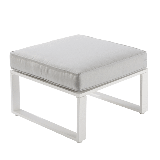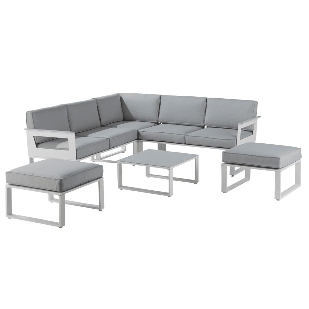Salotto da giardino angolare Odyssea Naterial, composto da: un divano ad angolo, 2 pouf e un tavolino, in alluminio bianco e cuscini grigi
