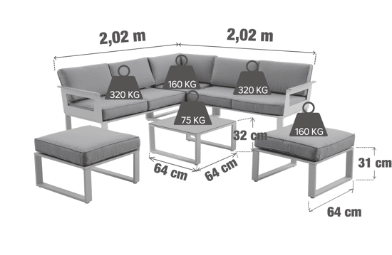 - La struttura in alluminio è garanzia di resistenza alla ruggine e agli agenti atmosferici - l rivestimenti dei cuscini sono sfoderabili per una facile pulizia.