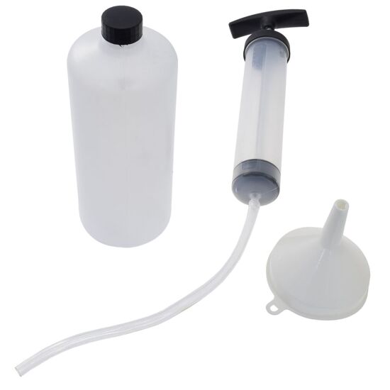 - Cambiare velocemente ogni tipo di olio o carburante. Il kit contiene: -siringa con tubo flessibile - imbuto travasatore - bottiglia recupero liquidi