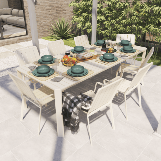 Abbina il tavolo da esterno Idaho a sedie coordinate della stessa serie per creare un ambiente armonioso ed elegante. Scegli cuscini e complementi nei toni naturali per esaltare il colore beige e ottenere un risultato raffinato e accogliente.