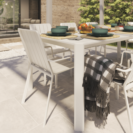 - Realizzato in alluminio leggero ma solido, il tavolo da pranzo è progettato per rimanere all’aperto in ogni stagione.