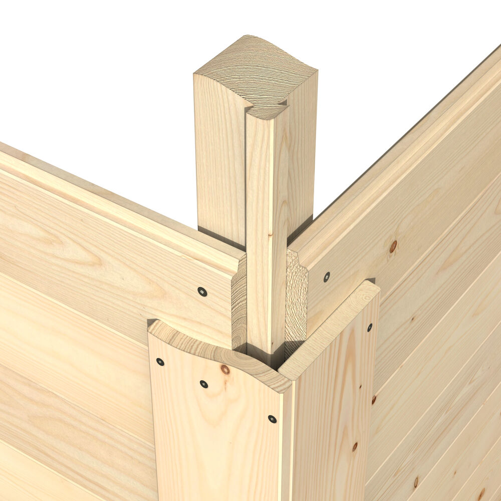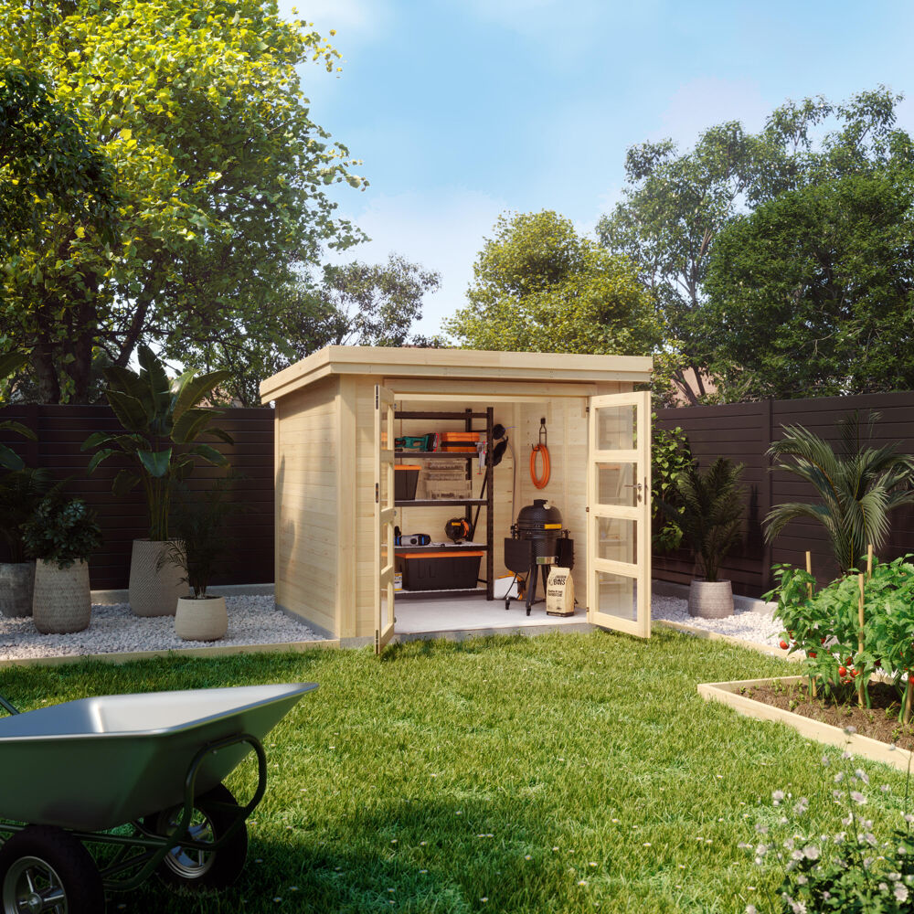 - Progettato per durare, si distingue per le pareti spesse 28 mm e il tetto ad unica pendenza realizzato con pannelli OSB rivestiti con feltro bituminoso
