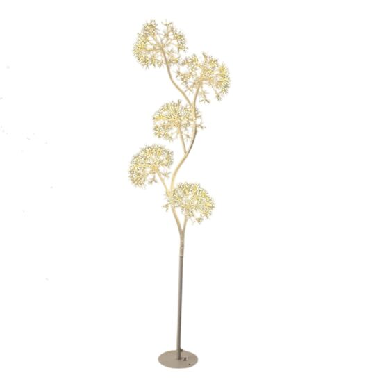 La struttura, completamente bianca, è realizzata con tronco e rami modellabili dotati di anima in metallo, che consentono di creare con facilità la forma desiderata. Dai rami si diramano cinque sfere luminose da Ø30 cm composte da sottili fili metallici, all'interno dei quali sono integrati 1800 MicroLED Bianco Caldo (Ø1,5 mm). Appartenente alla serie RICH, utilizza LED con gambo da 3 cm che offrono una distribuzione della luce più ampia e uniforme, creando un effetto visivo ricco e sofisticato.