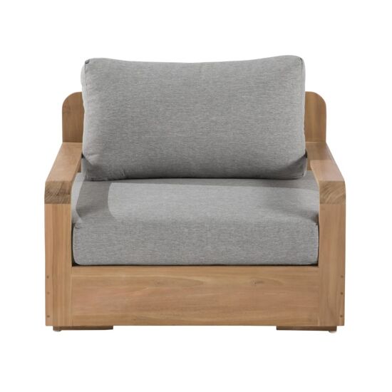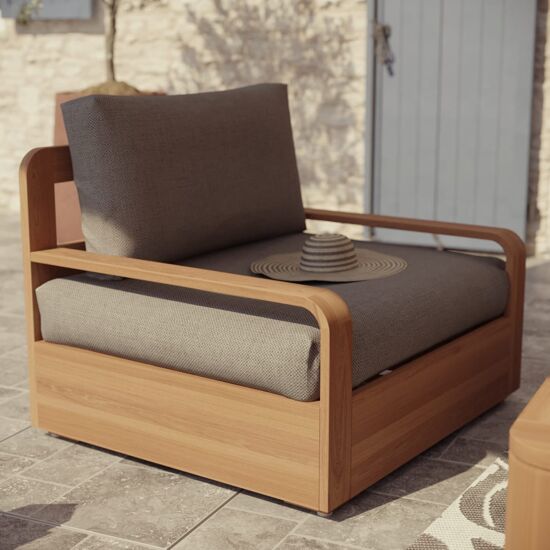 La combinazione tra teak dorato e cuscini grigio medio dona al patio uno stile naturale e contemporaneo. Le forme smussate della struttura aggiungono morbidezza visiva, mentre la seduta profonda e i braccioli ampi valorizzano l’esperienza di comfort.