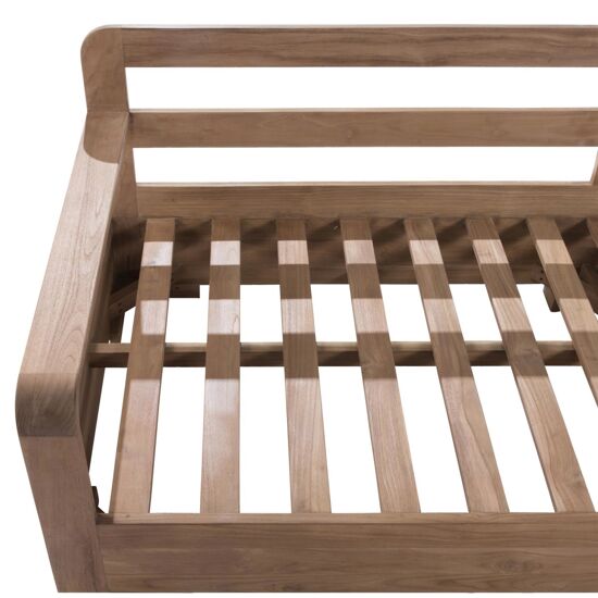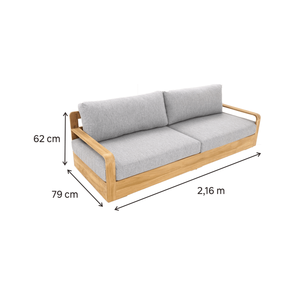 Con il passare del tempo, il teak tende naturalmente ad assumere una tonalità grigiastra. Per mantenere il colore originale è possibile applicare periodicamente un olio specifico per teak. Durante l’inverno o in caso di inutilizzo prolungato, si consiglia di proteggere il divano con una copertura traspirante e di riporre i cuscini in luogo asciutto.