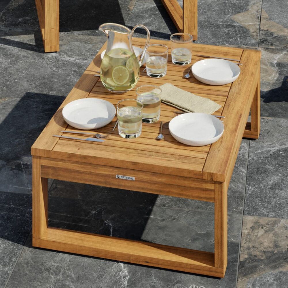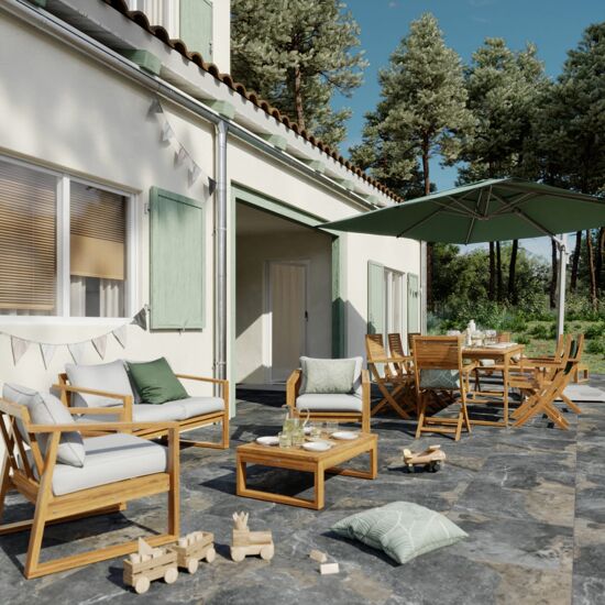 Per preservare la qualità del legno nel tempo, si consiglia di nutrire la struttura una o due volte l’anno con olio specifico per teak o legni esotici e di coprire il set durante i periodi di inutilizzo.
